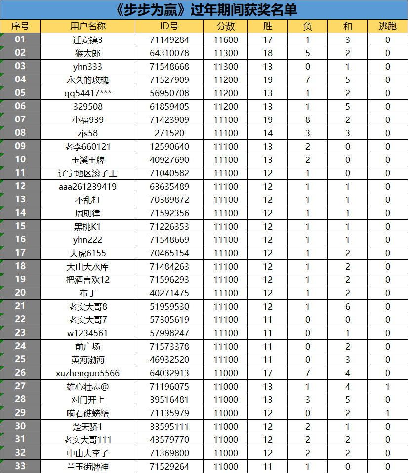 以上33名玩家获得100娱网币,奖励已发放至背包,请注意查收!